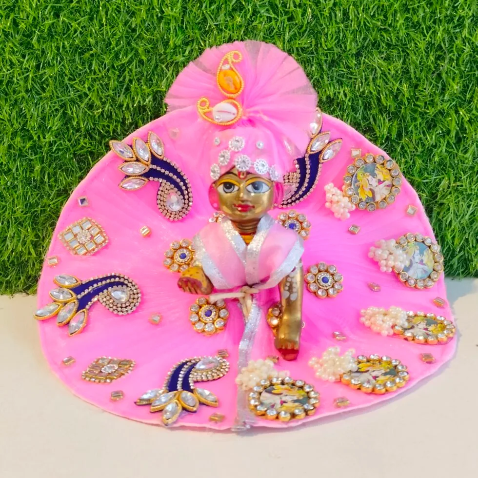 A beautiful pink Poshak (traditional dress) for Laddu Gopal Ji is a charming and elegant outfit designed to adorn the idol of Lord Krishna. This Poshak typically features soft, luxurious fabric, often silk or satin, in a rich, vibrant shade of pink. The dress is carefully crafted with intricate embroidery, with gold or silver thread work highlighting delicate floral patterns, paisleys, or religious symbols.
